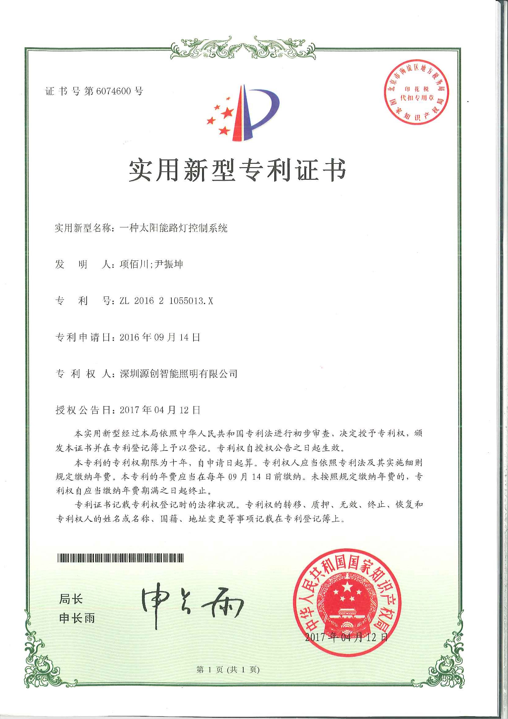 實用新型專利一種太陽能路燈控制系統