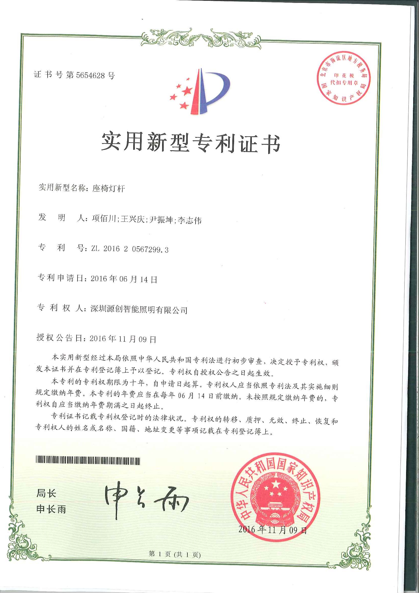 實用新型專利座椅燈桿