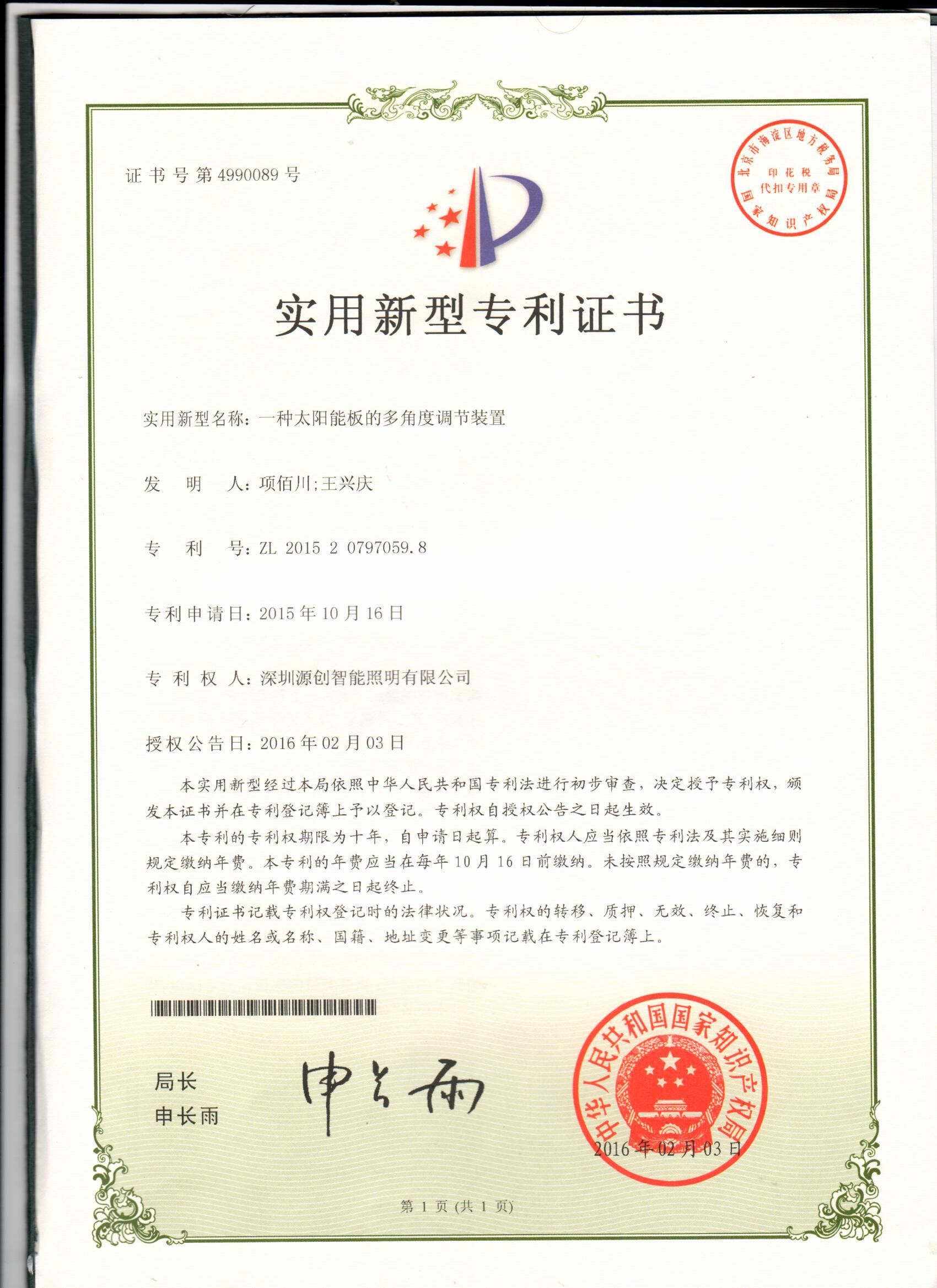 太陽能板的多角度調節裝置實用新型專利證書